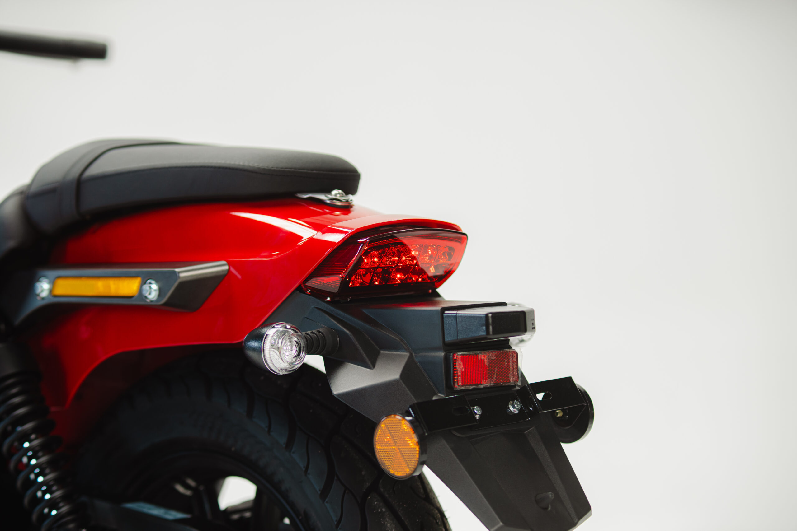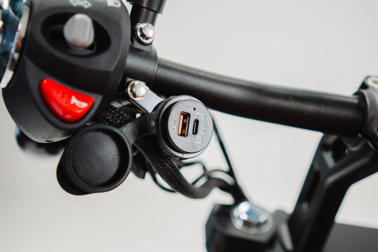 Cavalete central, descanso lateral, porta USB e USB-C.