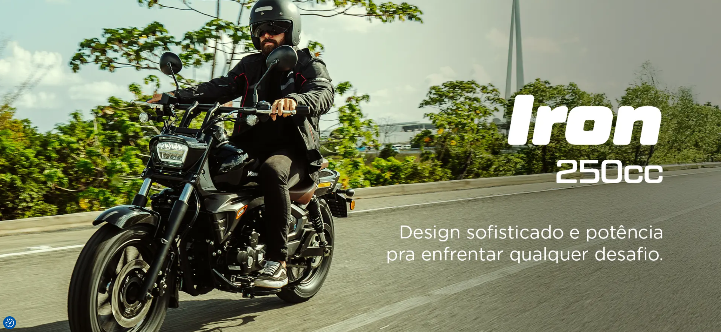 A Iron 250 é uma moto custom que combina design clássico com tecnologia moderna, focada em estilo e desempenho para uso urbano e viagens, com motor monocilíndrico de 249,6cc, 27,67 cv, injeção eletrônica, freios ABS de dois canais, iluminação Full LED, painel digital/analógico, portas USB e câmbio de 6 marchas, oferecendo uma pilotagem confortável com boa presença nas ruas.