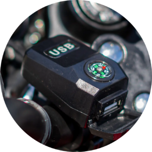 Protetor de escapamento, porta USB, cavalete central e descanso lateral.
