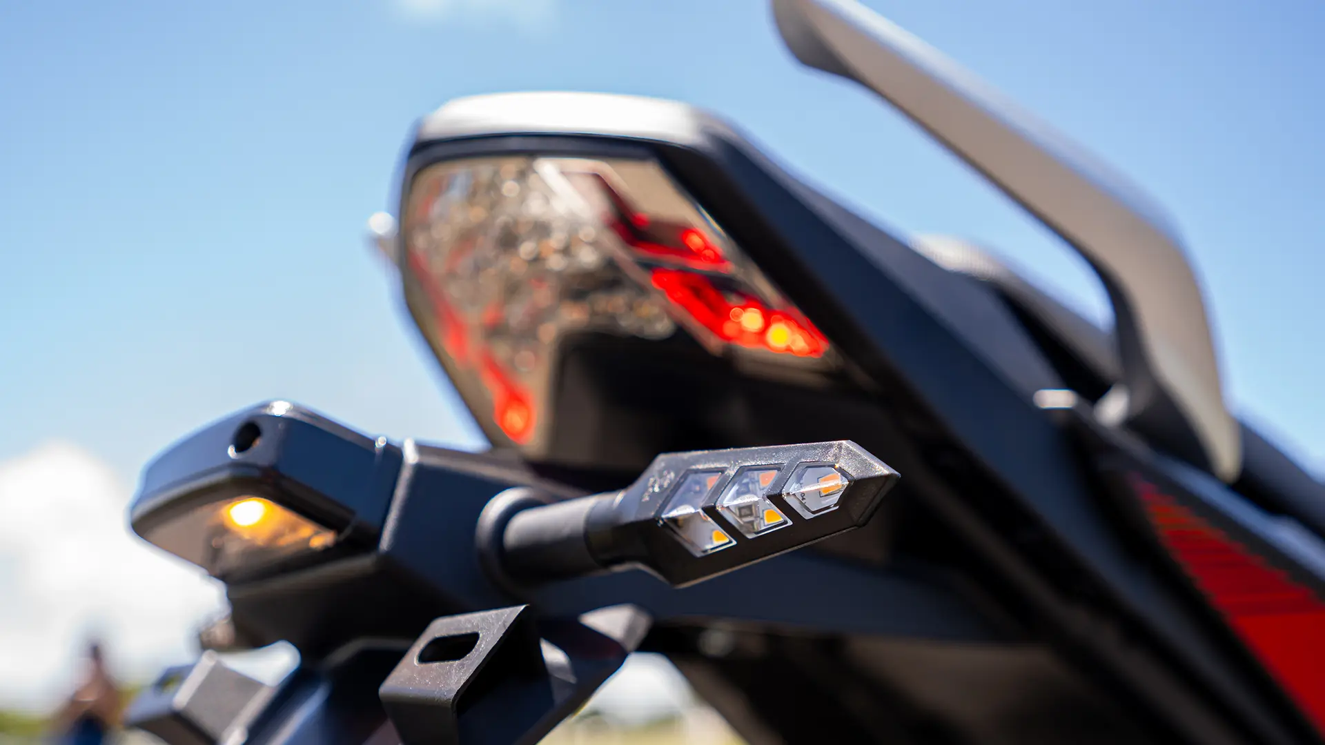 Protetor de escapamento, porta USB, cavalete central e descanso lateral.