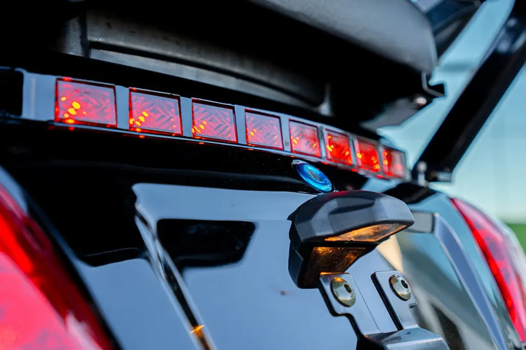 em ambas as rodas, painel digital, luzes LED, e capacidade para dois passageiros com