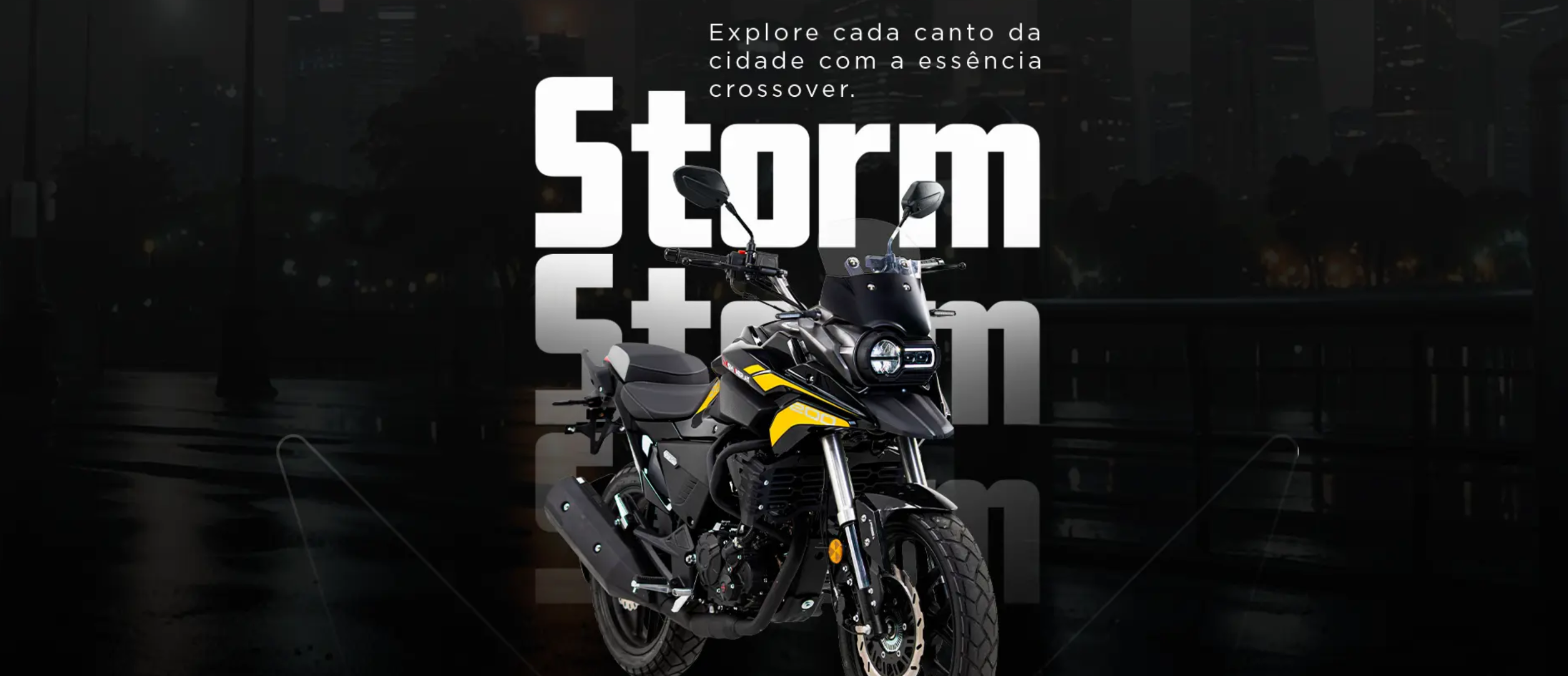 A Storm 200 EFI é uma moto crossover versátil, com design arrojado, motor monocilíndrico de 198cc refrigeração líquida, 20,4cv, 6 marchas e freios ABS de duplo canal, ideal para uso urbano e aventuras, destacando-se pelo visual moderno, painel Full LED com cores customizáveis, suspensão dianteira invertida, altura de assento acessível (790mm) e bom custo-benefício, combinando tecnologia e desempenho.